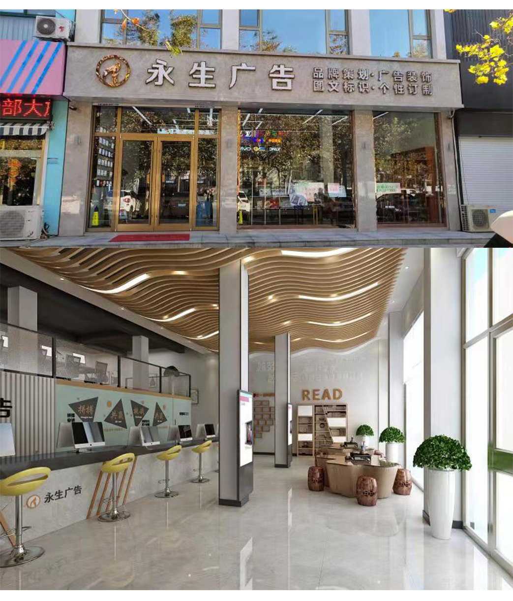 公司自有數(shù)碼沖床設(shè)備、500W光纖機(jī)、高精度大幅面噴繪機(jī)、寫真機(jī)、UV機(jī)、多種大小型雕刻機(jī)、吸塑機(jī)、全自動(dòng)圍字機(jī)、自動(dòng)開槽機(jī)、激光焊接機(jī)、拋光機(jī)等生產(chǎn)加工設(shè)備,擁有完善的設(shè)計(jì)團(tuán)隊(duì)、技術(shù)團(tuán)隊(duì)、施工團(tuán)隊(duì)、售后團(tuán)隊(duì),可為廣大客戶提供室內(nèi)裝修、店招門頭、精神堡壘、黨建標(biāo)識(shí)、標(biāo)識(shí)標(biāo)牌、宣傳欄、LED顯示屏、警示標(biāo)識(shí)、精品字、證卡胸牌、證書獎(jiǎng)杯、燈箱、桌牌、定制禮品、展具、噴印等多種專業(yè)廣告服務(wù)...